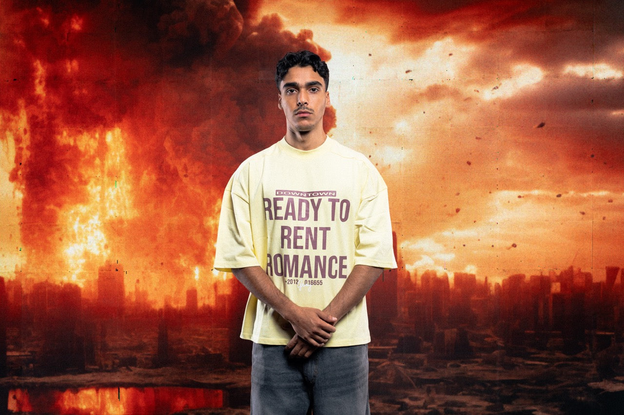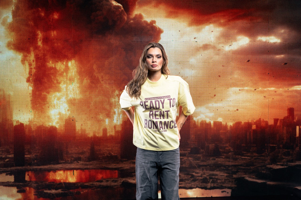 Make a bold statement with the Downtown Ready to Rent Romance oversized T-shirt. Featuring an eye-catching block text print with a unique phone number detail and playful script signature, this tee combines streetwear attitude with a touch of ironic romance. Crafted from soft, breathable cotton, it offers a relaxed drop-shoulder fit for all-day comfort. Available in multiple vibrant colorways — from classic black and charcoal to electric blue and sunshine yellow — each version pairs striking typography with high-contrast color combinations, making it perfect for casual styling or as a standout fashion piece.